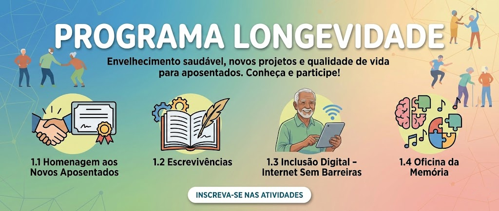 O Programa LongevIDADE tem como finalidade promover atividades que contribuam para o enfrentamento saudável das mudanças decorrentes do processo de aposentadoria e do envelhecimento, estimulando a construção de novos projetos de vida, a ampliação da participação social e a melhoria da qualidade de vida dos aposentados. Conheça cada atividade do programa e inscreva-se.